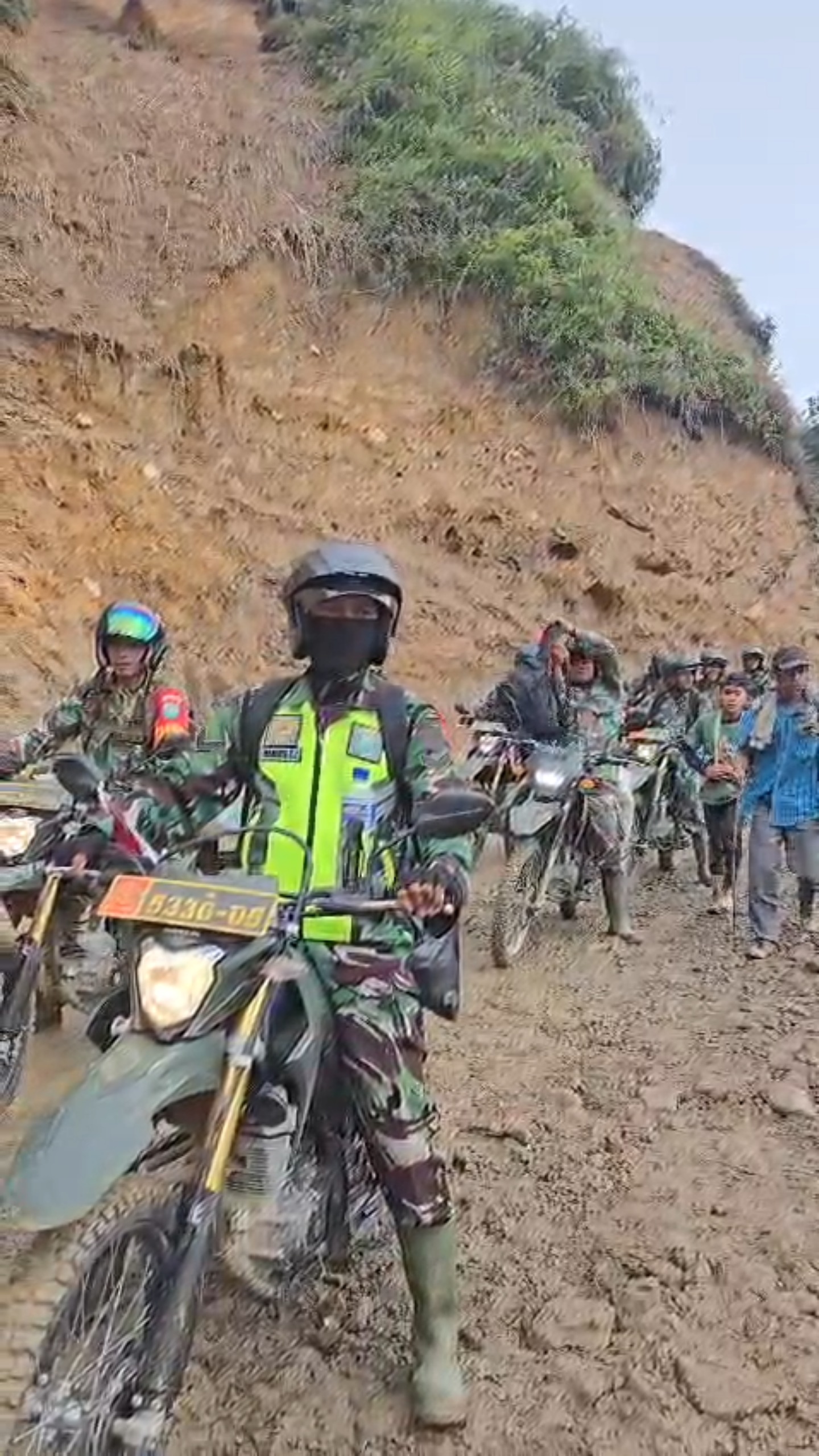 Dengan membawa muatan sekitar 25 kilogram beras per masing-masing motor, para prajurit Babinsa masih harus melintasi jembatan darurat dari pepohonan serta kawasan bekas longsor demi memastikan bantuan dapat tiba di wilayah terdampak.