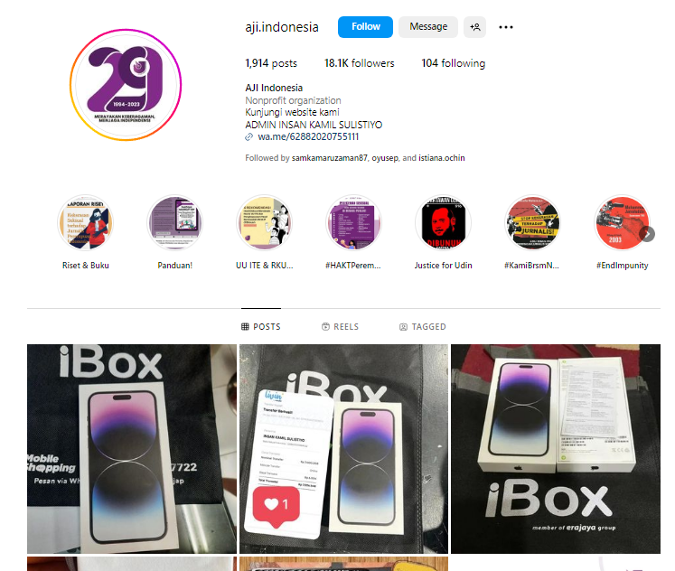 Olehnya, AJI Indonesia mengimbau warganet untuk mengabaikan konten yang beredar di akun Instagram AJI Indonesia agar tidak muncul kerugian ekonomi ataupun lainnya.