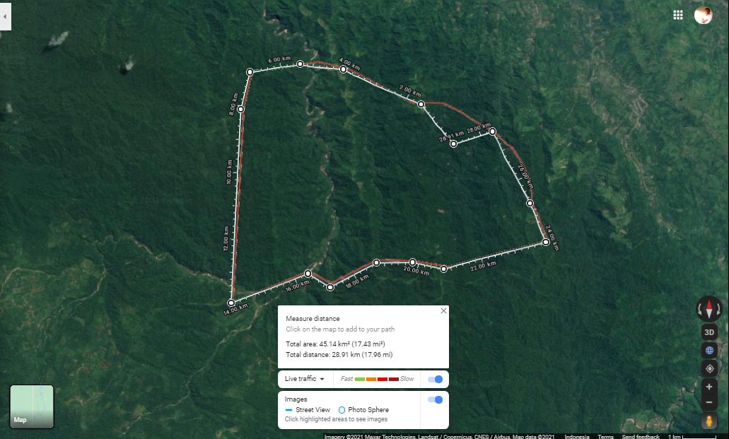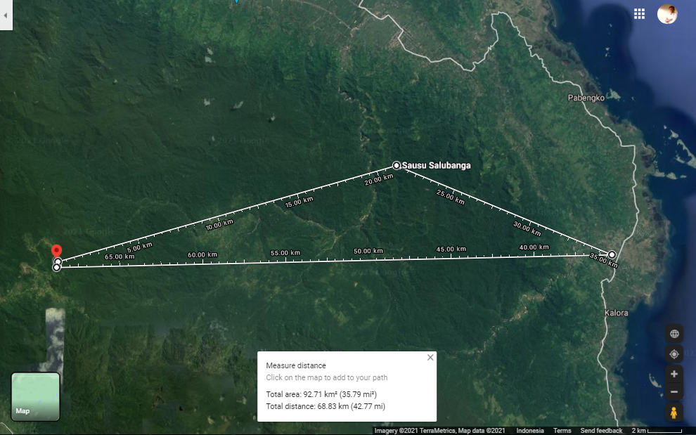 Dari pengukuran menggunakan menu measure distance yang tersedia di Google Maps dapat diketahui luasan area pergerakan Ali Kalora dan kelompoknya pada cakupan areal seluas 92,71 kilometer per segi (dengan asumsi garis lurus). Namun dari informasi yang ada diketahui mereka menggunakan jalur sungai untuk bergerak dari Lembantongoa, Sigi ke Salubanga, Parigi Moutong dan Poso Pesisir Utara, Poso. Sementara, Salubanga sendiri mencakup areal seluas 45,14 kilometer per segi.