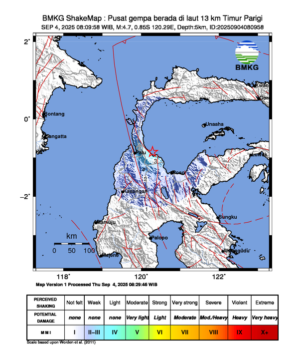 Gempa bumi dengan magnitudo 4,7 mengguncang wilayah Parigi, Sulawesi Tengah, pukul 09.09 WITA.