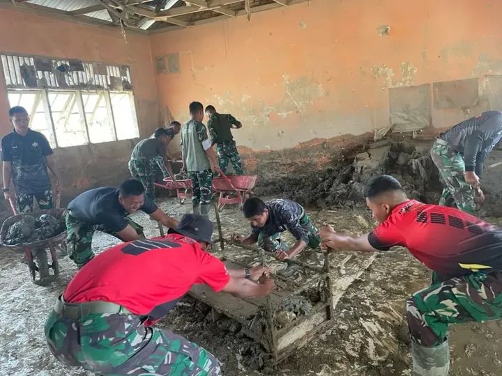 Sejak pagi, personel TNI tampak bahu-membahu melakukan pembersihan. Lumpur dan material sisa banjir disingkirkan secara bertahap agar lingkungan sekolah kembali bersih, aman, dan layak digunakan.